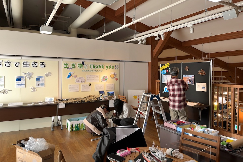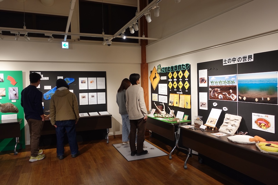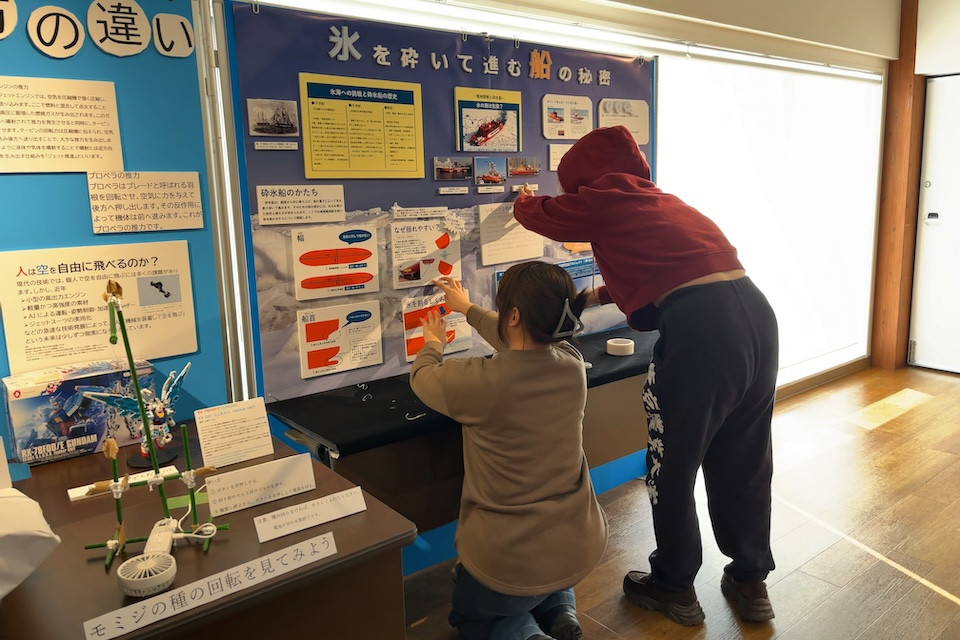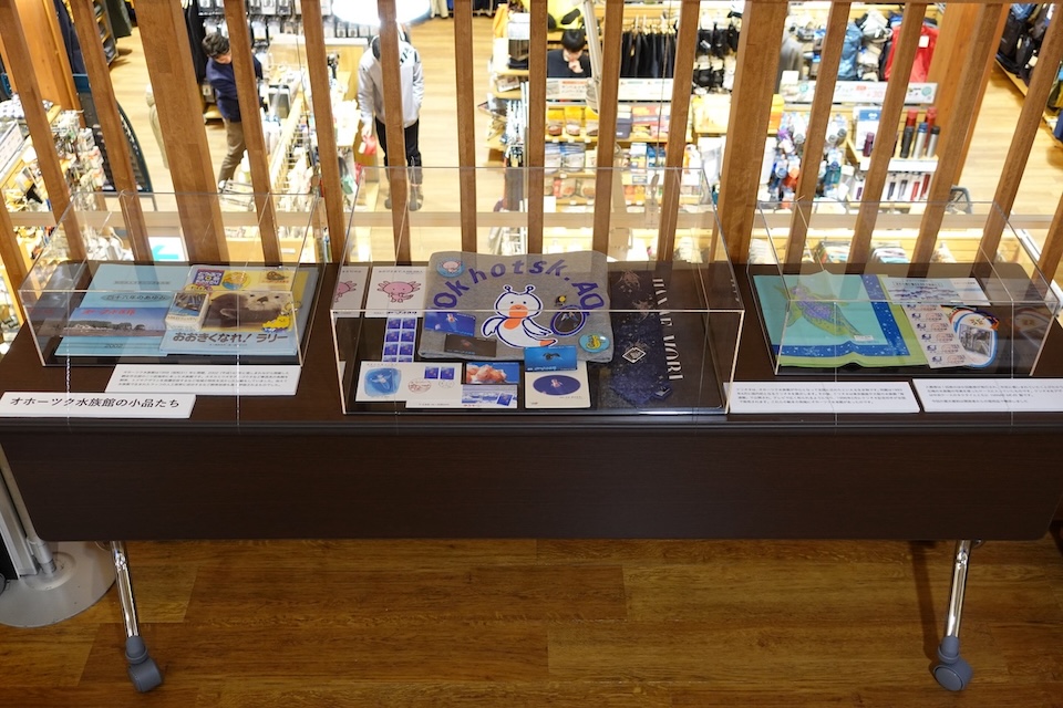 サケ頭骨、トビとエゾフクロウの羽毛標本、いろいろな動物注意の道路標識、エゾシカ頭骨、さわれるシカ角、クロオオアリの巣、アサリ立体パズル、ハンディ扇風機を用いたモミジの種の回転装置、砕氷船の砕氷模型、オオオナモミの魚釣り、立って乗るハニカム構造の画用紙、汚れないヨーグルトの蓋の顕微鏡映像、オホーツク水族館のお土産や森英恵デザインの小物類
