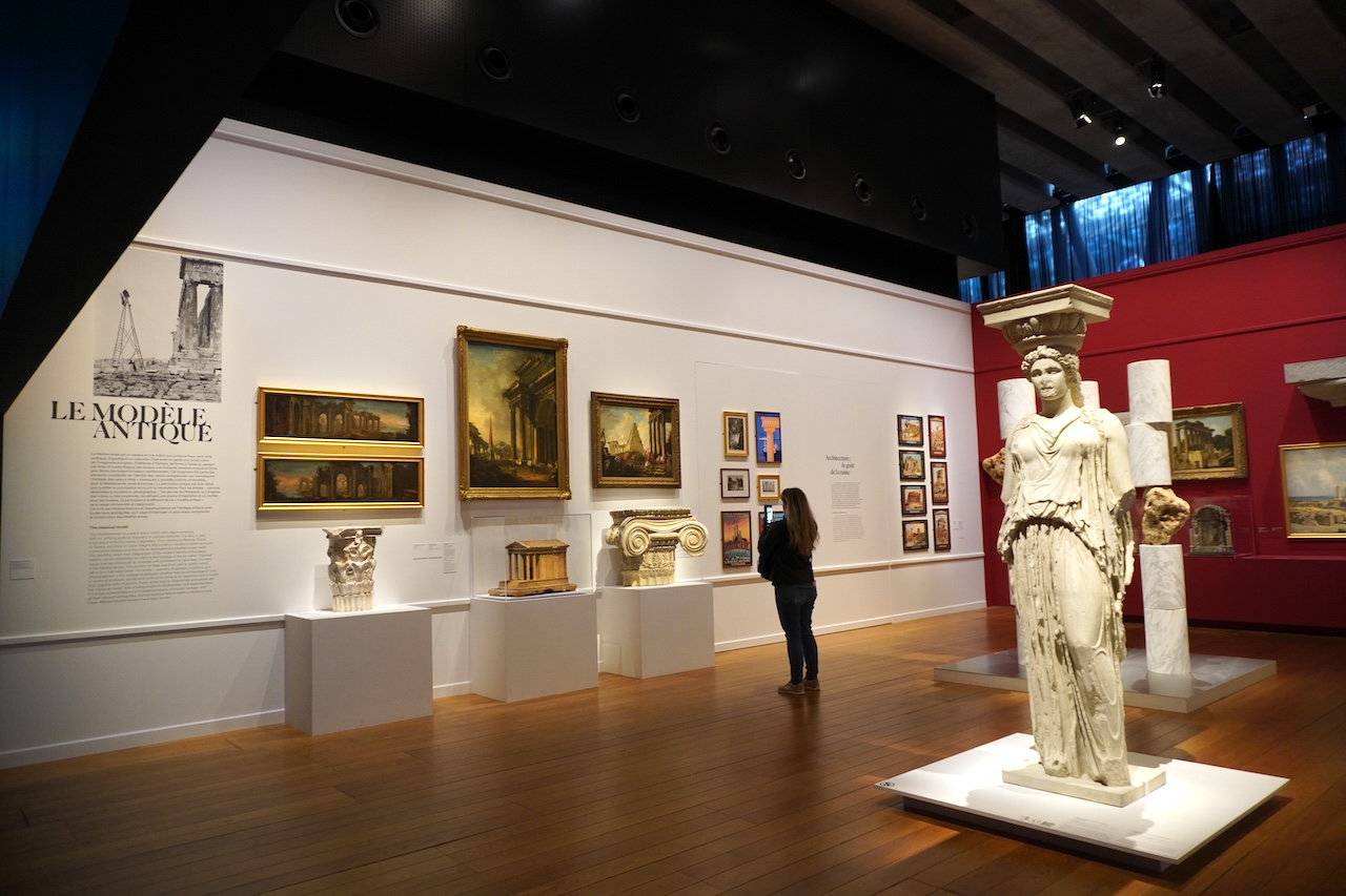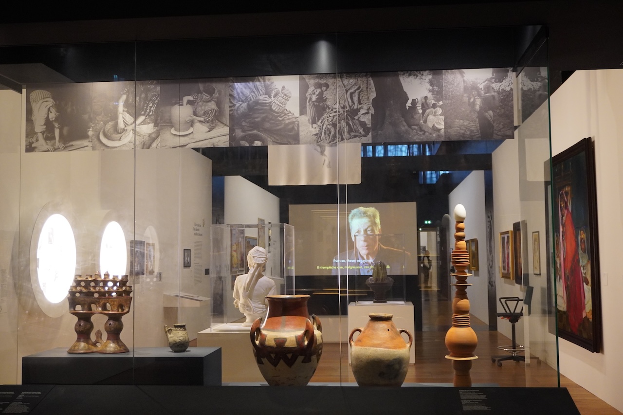主題の「地中海」の展示について公式サイトは「美術史と民族学が地中海の「イメージ」の創造にどのように貢献してきたかを発見することで、これらのイメージがどのように形成され、広まってきたか、特に美術館の役割を検証する」[DeepL翻訳]と語る。実際の展示は地理的には古代ローマを範囲にしており、その正統な後継者を自認するヨーロッパに加え、北アフリカや近東まで含めて古代古代の継承者として扱っている。展示にはおなじギリシア・ローマの継承者でありながら、西欧は南や東の地域を植民地として支配し他者としてきたことを映像も加えて検証している。その区分や他者性の創造には美術館や民族学博物館も加わったことも含めて。この歴史や反省は現代の北アフリカからヨーロッパへの移民問題にもつながる視点だ。EU域外の彼らは遠い親戚やもしかしたら家族なのか、それとも異文化の住民で他者なのかと。