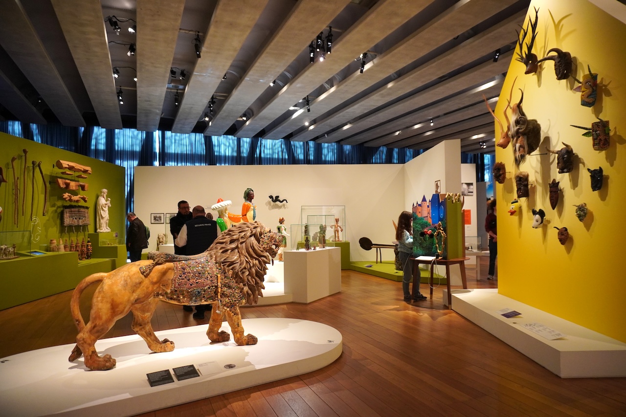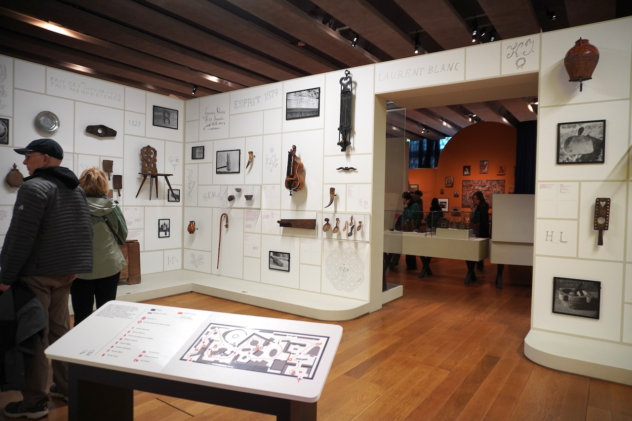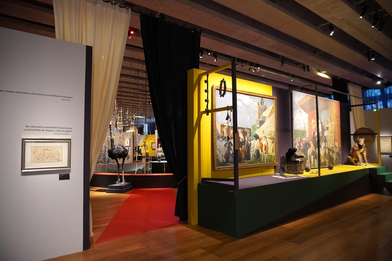 訪問時に特別展は3つ開催されており、そのうち2つを観覧した。公式サイトによると、特別展「さあ、舞台へ!」は道化師や曲芸師などサーカスや演芸の痕跡の映し出された儚さとファンタジー、遺物と不穏な祝祭の繊細な物語だという。今回の訪問は民俗資料の展示や名称を知ることが目的だったので、深く鑑賞する気持ちがなく、実際に見ても理解困難でさらっと見ただけだった。これから記すのは後日に写真やネット情報からの構築となる。展示コーナーの入口には詩人のアポリネールの「しかし、観客は皆、自分の中に奇跡の子を探していた[Mais chaque spectateur cherchait en soi l’enfant miraculeux]」やボードレールの「誰の感受性も軽んじてはならない。それぞれの感受性こそがその人の才能である[Ne méprisez la sensibilité de personne. La sensibilité de chacun, c’est son génie]」の言葉が壁に記され、サーカスを題材にした近代絵画がある。サーカスや大道芸に対する芸術家の解釈をまず見ることになる。展示室に入ると綱渡りの映像や縄ばしごと網がぶら下がるの円く囲われた作品が現れる。明らかにサーカスを題材にしたもので、周りには出演者たちの衣装を着たマネキン、巨匠が描いた絵画などがある。これはオペラのような総合芸術を意識したもので没入して体感する展示なのだろう。鑑賞は入口で出会った制作者によるお題を心に留めておき、知っているはずの衣装や装置、登場人物や動物と新に出会うという筋書きに思える。